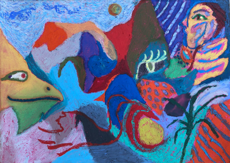 'Fairy Land', gouache, soft pastel, oil pastel, oil stick and collaged cardboard, 46x55cm. 2024. *SOLD